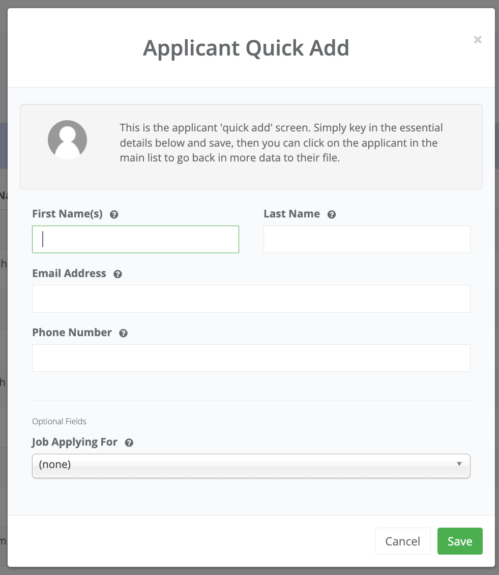You can choose to manually add in a new Applicant's information using First Name, Last Name, Email Address, and Phone Number. You can also choose to associate the Applicant with a specific Job or not associate that Applicant with a Job at this time. Linking past Applicants with a new position can always be done at a later time.