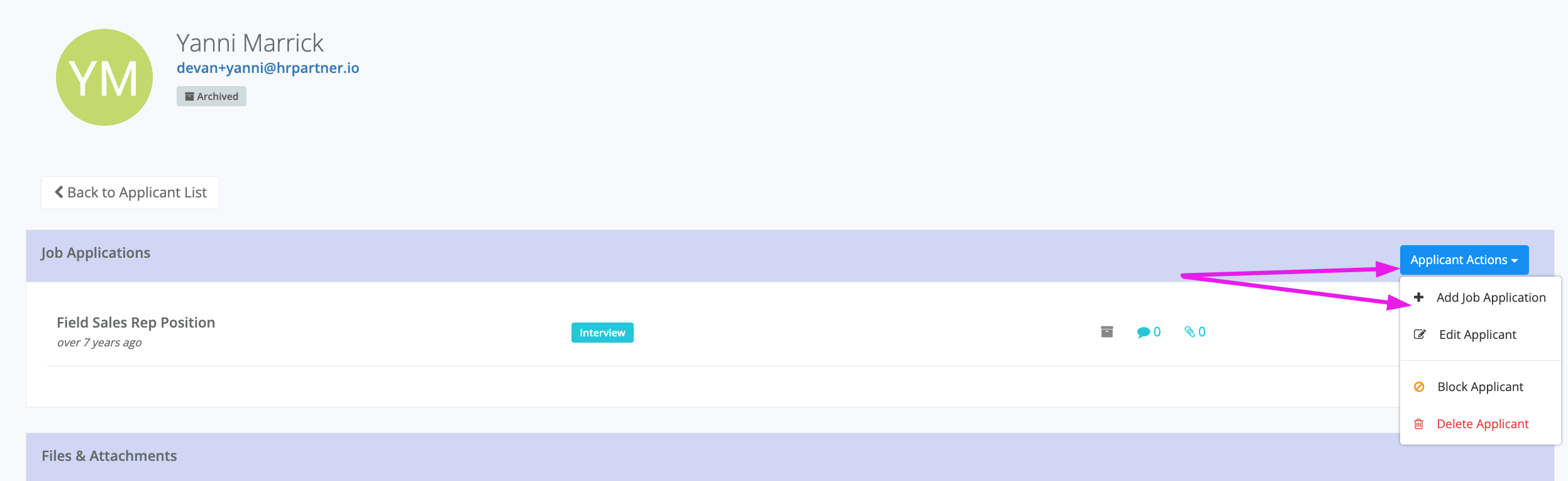 In HR Partner, you can find past Applicants and associate them with new positions. This gives you a full overview of any positions they've applied for in the past and will help you avoid double entry.