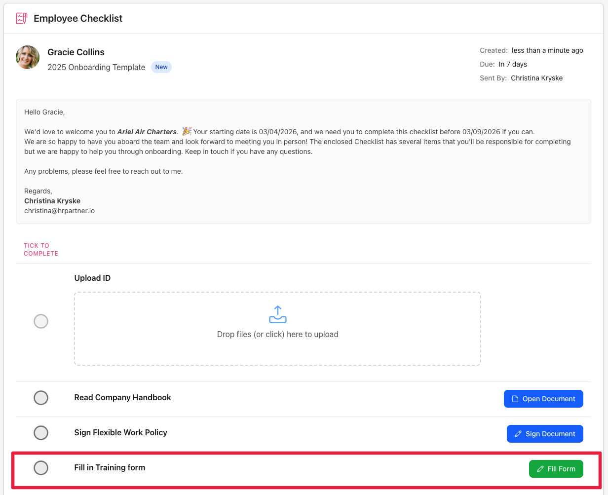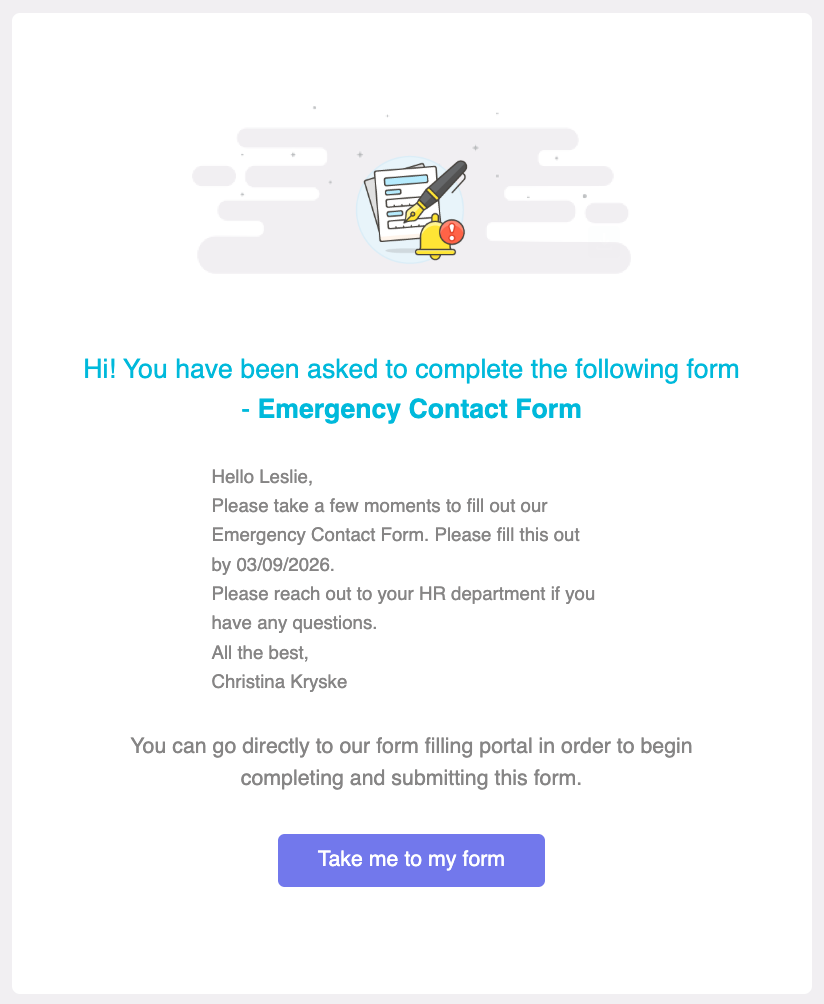 Note: You can still log in to your Employee Portal and find the assigned form in there (under the "Forms" menu on the left) and fill it in that way. So don't worry if you lose the email or if it gets sent to your spam folder.