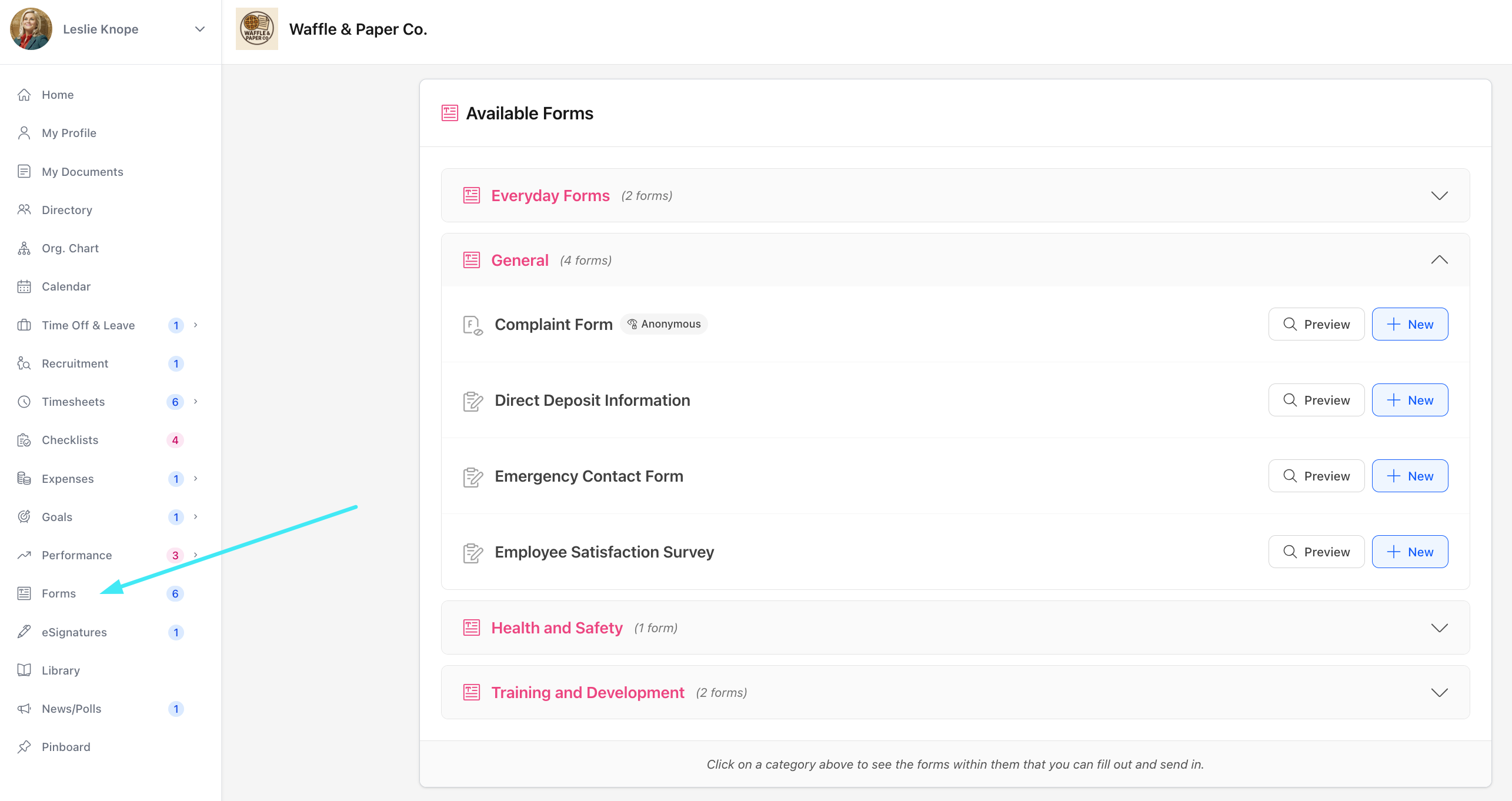 You don't have to wait for an Admin to send you a form in any of the above methods. You can actually pick a company form and fill it in yourself at any time. This is especially useful if it is a requisition form for a company asset, some training, or even a complaint or accident report. In these cases, you, as the employee, do not have to wait for someone else to start the process, but can do so yourself.