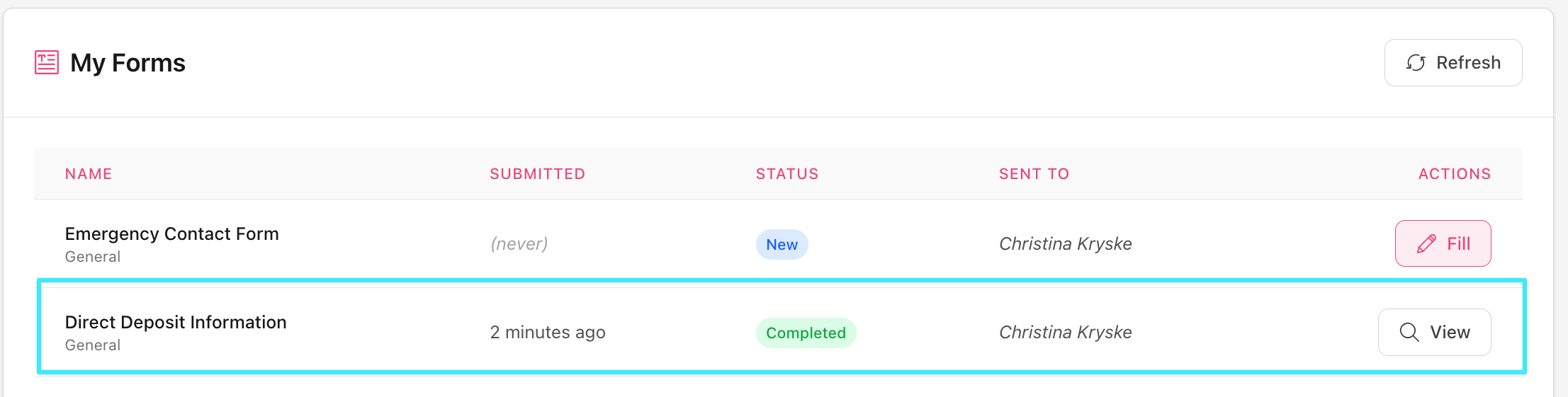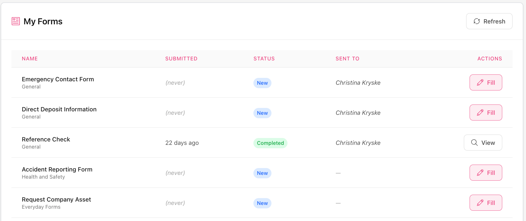 Lower down on the screen is the 'My Forms' area, which shows you all the forms that have been either assigned to you or else that you have created yourself and submitted earlier. Select the 'Fill' icon to get started filling out the forms. This is a useful track of the history of forms you have filled in in the past.