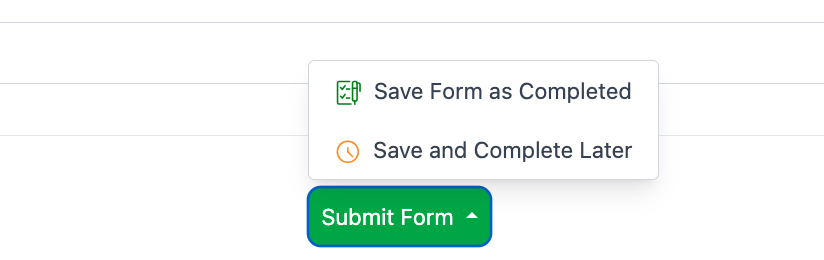 If you need to save your answers, but come back to finish filling out the form at another time, you can select the arrow in the 'Submit Form' button and select the option to 'Save and Complete Later'. Your form's status will be 'Incomplete' until you complete and submit the form.