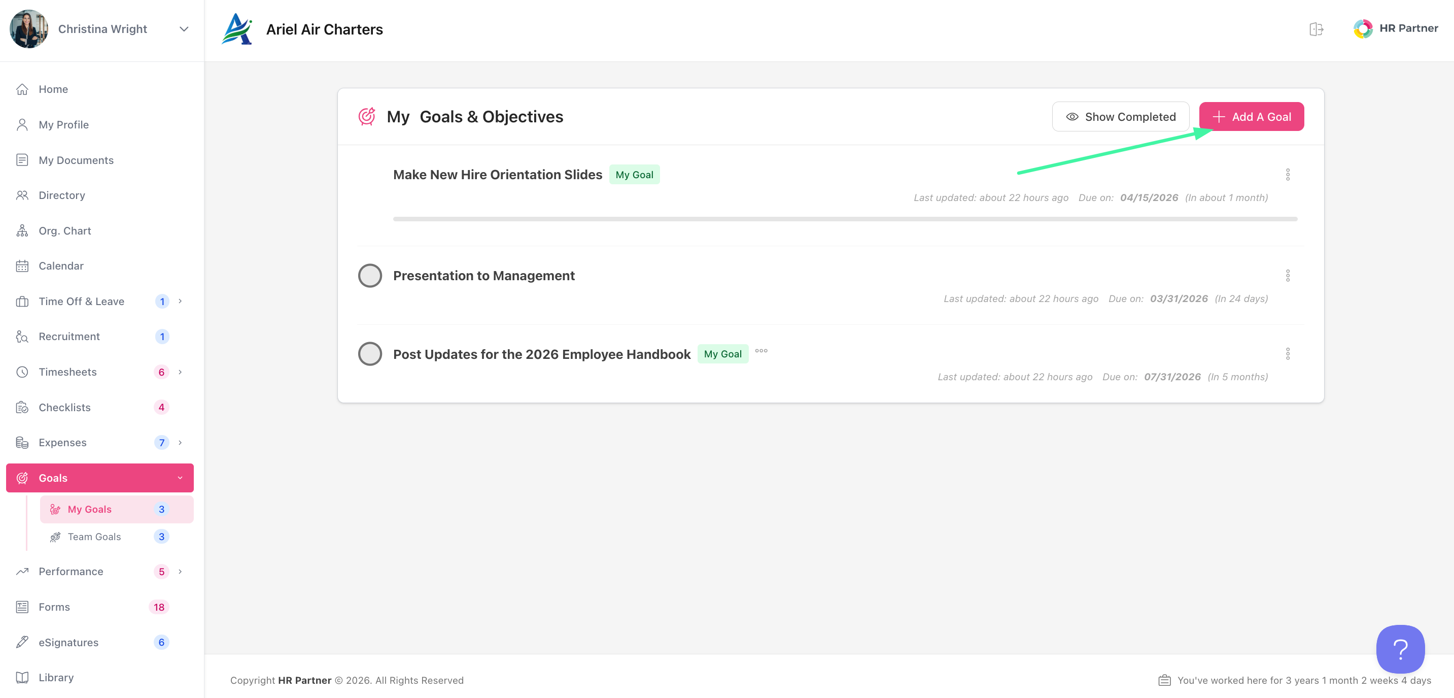 To add your own goals, you can go to your left-hand menu and select Goals > My Goals: