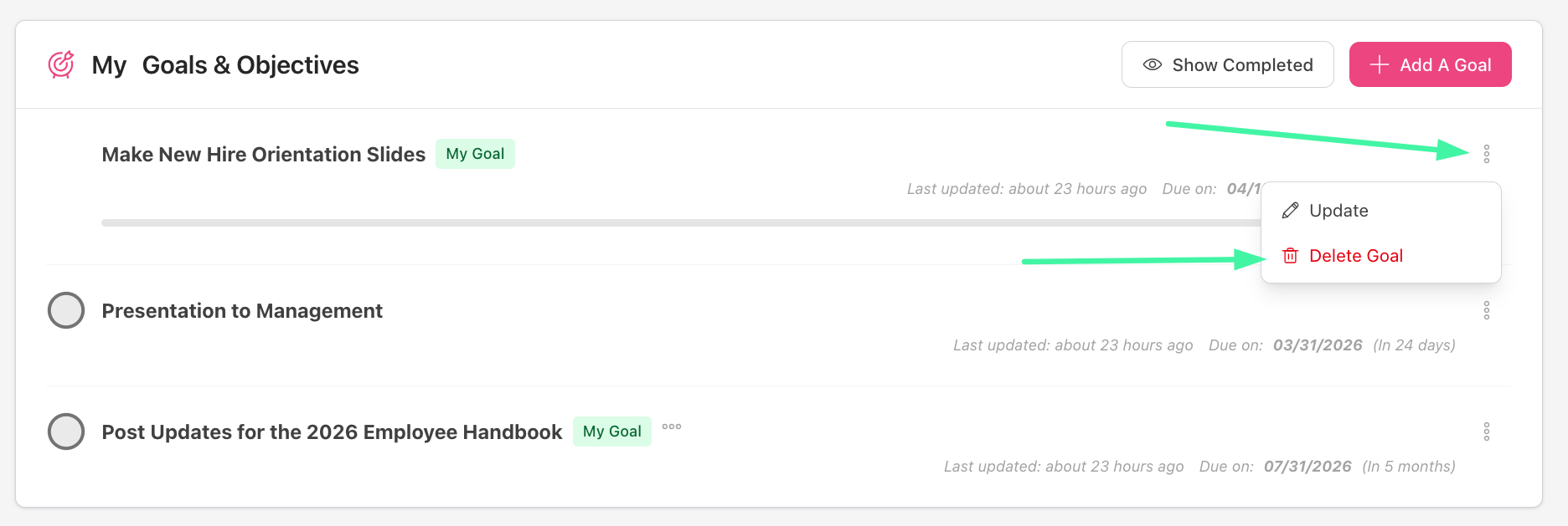 You can only delete goals that you have created yourself. Company-set goals cannot be deleted by an employee and have to be deleted by an admin user.