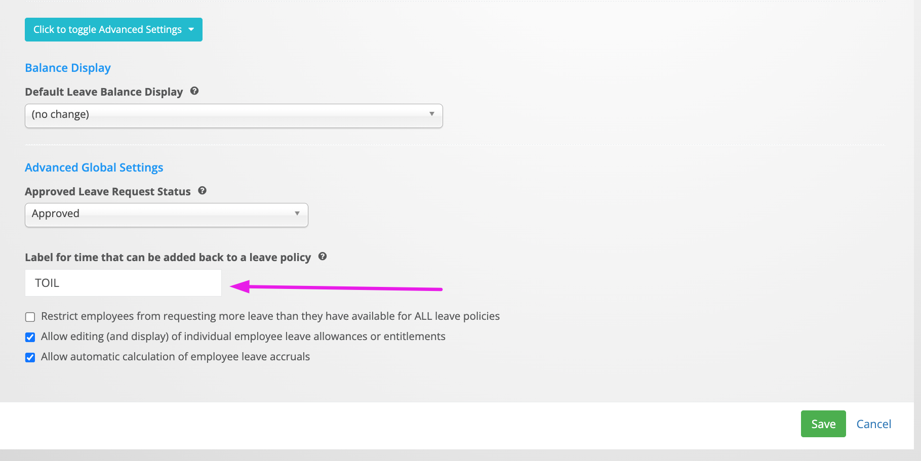 This process of adding leave back is normally called TOIL (Time Off In Lieu) or Flexi-Time or sometimes Comp Time, based on your region and organizational requirements. The good news is that we allow you to customize the name of this leave type to suit your needs. To change the label of leave that gets added back, you can go to Time Off & Leave > Configure > Leave Settings > and scroll down to the Advanced Settings toggle.