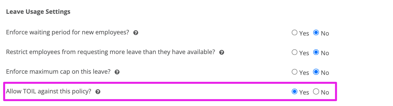 You can do this by going to Time Off & Leave > Configure > Leave Policies and clicking 'Edit' next to the leave policies to make this change. Scroll down to the Leave Usage Settings section towards the bottom, and select the 'Yes' option to allow 'TOIL' (the label you created will be here instead) against the policy.