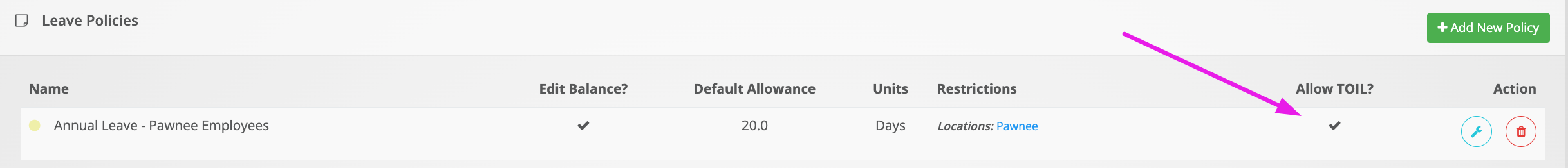 You can see which policy you allow TOIL against on the Time Off and Leave > Configure > Leave Policies page. Those selected will have a checkmark on the Allow TOIL? column.