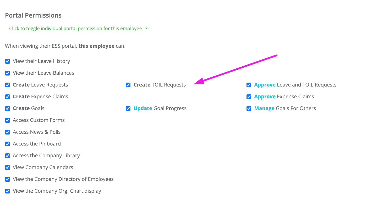 The name of the option you need to check is dependent on the naming convention you chose at the start of this article. For example where our screenshot shows "Create Lieu Requests" yours might say "Create TOIL Requests" or "Create Overtime Requests"