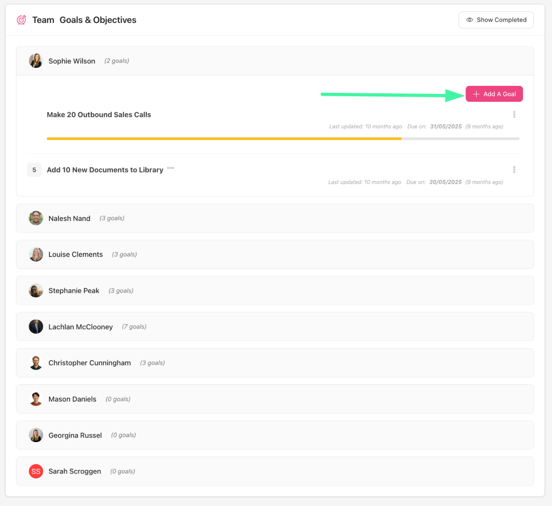 Clicking on "Team Goals" will open up a list of your direct reports and their open Goals. You'll also see the option to "+Add a Goal" beside each name: