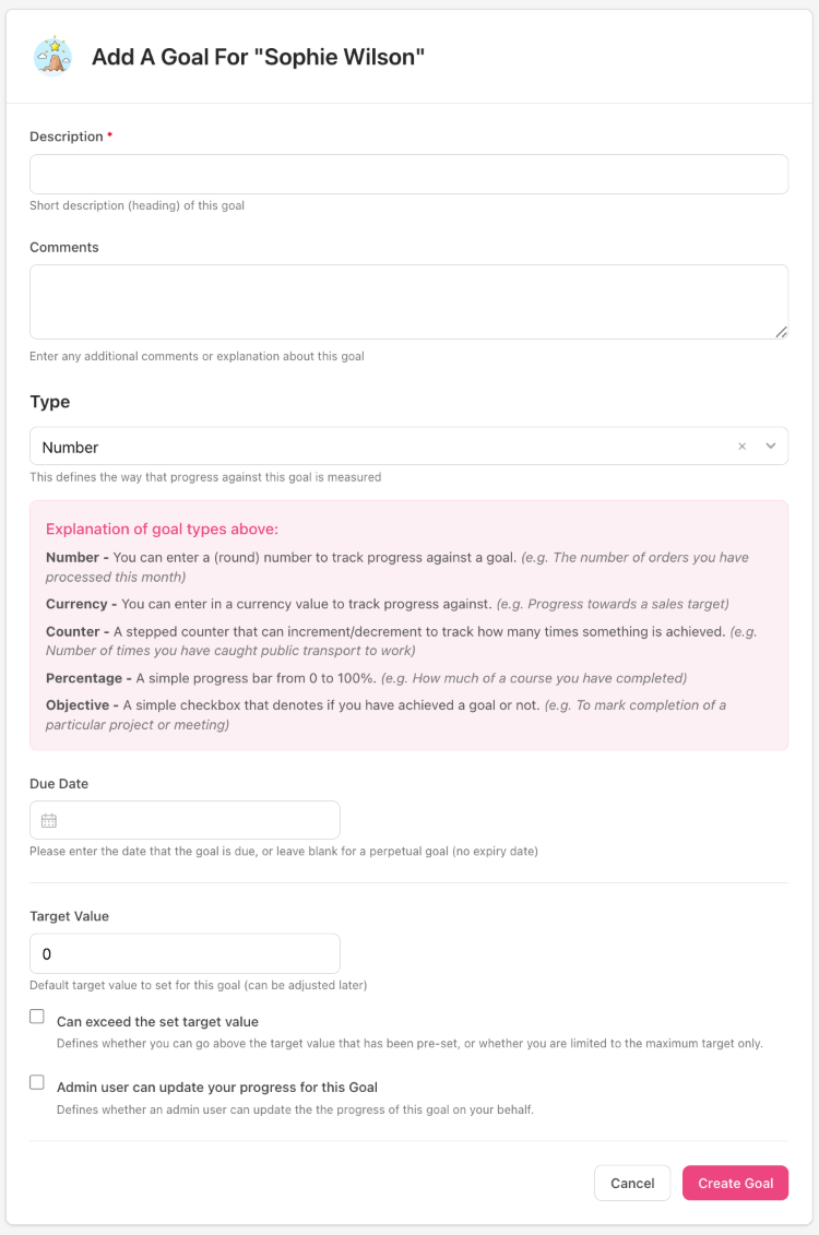 | Target Value | With some goal types (Number, Currency, Counter), you can set an expected Target value that they are supposed to reach. You can leave this at '0' to not measure them against a target, but sometimes you might have a selective quota they have to attain, and this will help them see how close they are getting. |