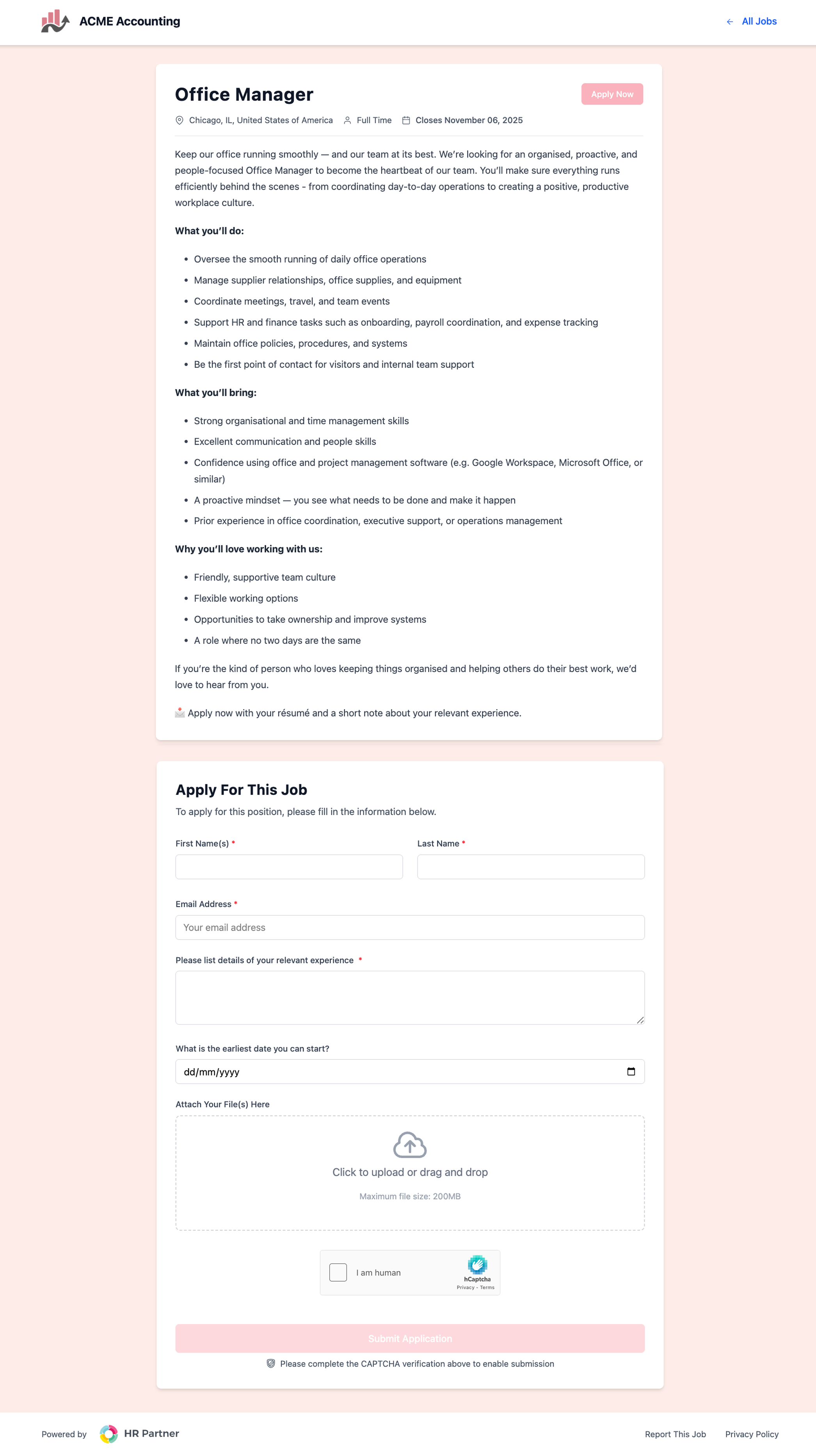 The HR Partner recruiting module allows you to create custom job boards that look professional and suit your company's brand. You can link to your job board straight from your website and include direct links to your job board or individual job postings from job advertisements or other job boards.