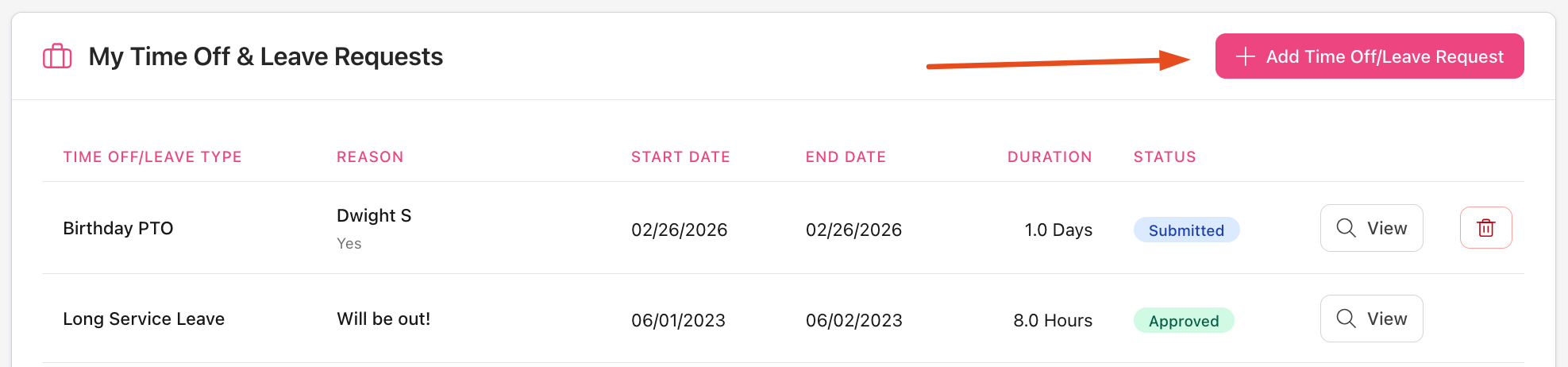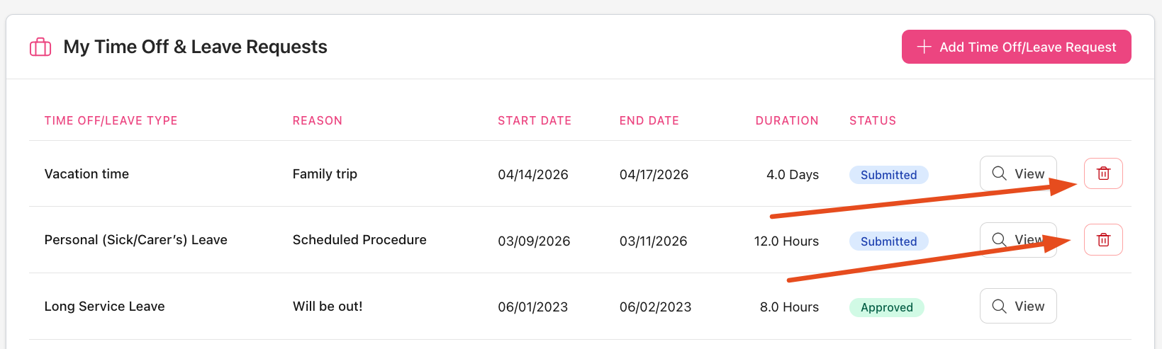 Perhaps you've accidentally submitted a Leave Request and now the dates of your time off have changed. As long as the Leave Request has not been Actioned (meaning that the Admin User has not already Approved or Rejected the request), you can go to your Time Off/Leave Requests history page and click on the red Delete Request button to delete the request entirely and start fresh.