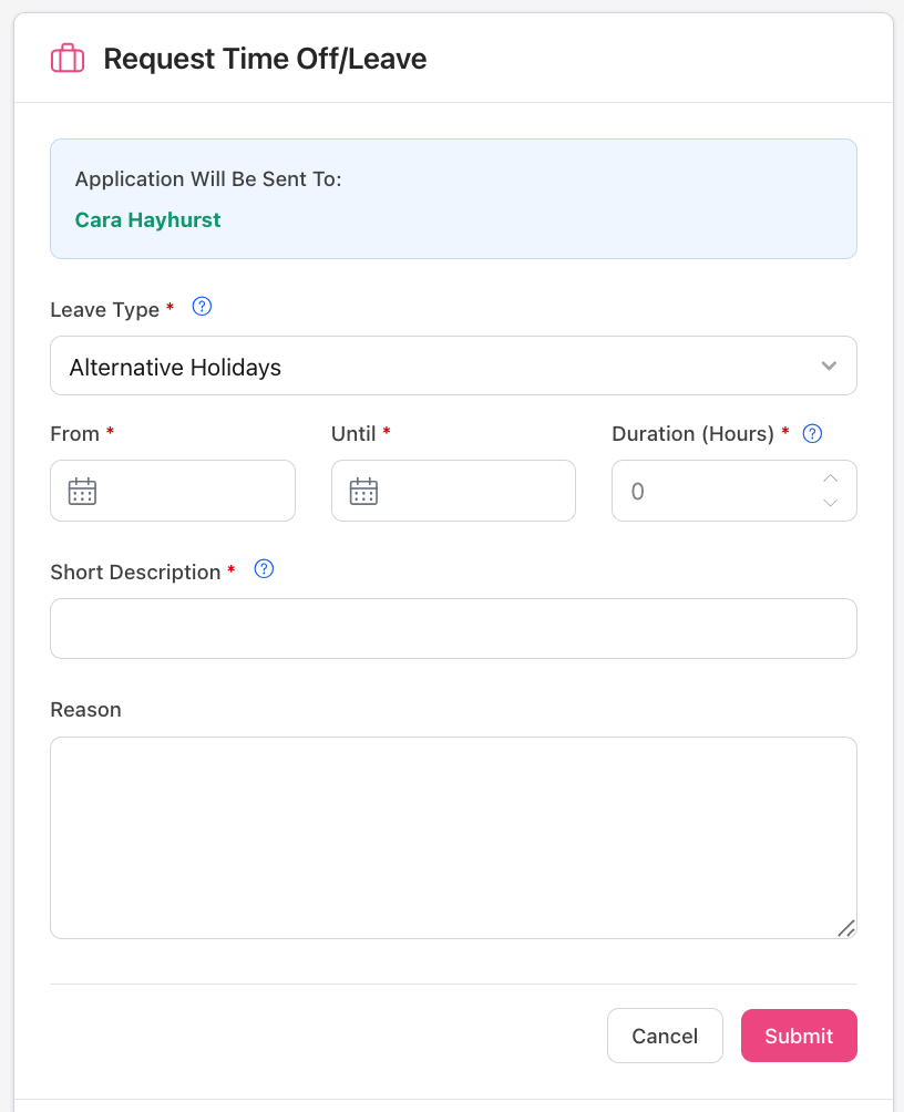 Once you're in your Leave Request Form, you will see who your leave request will be sent to (or you may need to select who to send the Leave Application to, depending on your setup). You will need to select the Leave Type, the Dates, and then add a Short Description (e.g., 'Family holiday' or 'Have to visit sick Aunt', etc. This will appear on your leave calendar that managers can see).