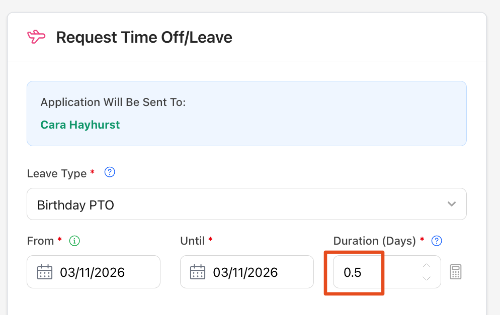 Many Organisations will choose to have the Duration automatically populate based on how your Leave Policy may be configured, but it's always a good idea to double-check the Duration as well!