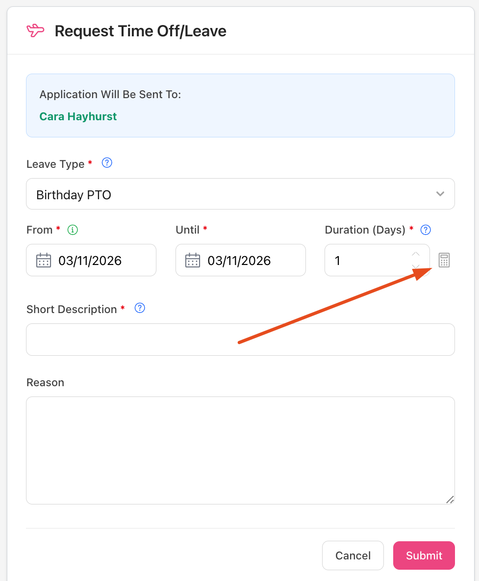 The Calculator icon will open up a separate window that allows you to "Specify Duration" or to request time off in exact hours (even minutes!) instead of a full day. This makes it easy to request partial days or half days. Please remember that your Admin User will still have the ability to edit your request based on your own Organisation's Leave Policy and guidelines.