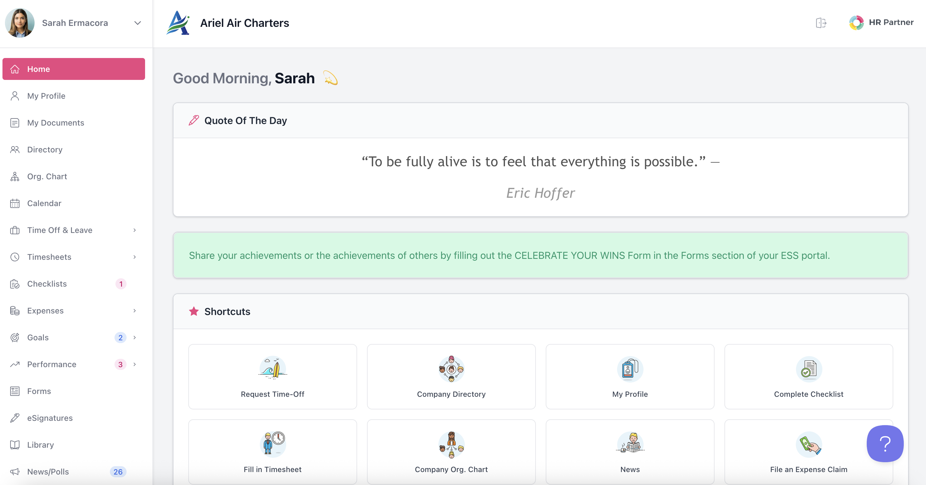If you are an Employee and your Organization is currently using HR Partner, there is a lot to learn! Below we've outlined a few of the major parts of the system that can help you navigate through your own Employee Portal and get started using the system for your needs. Please also refer back to our other articles for Employees to learn more about Leave Requests, Checklists and much more!