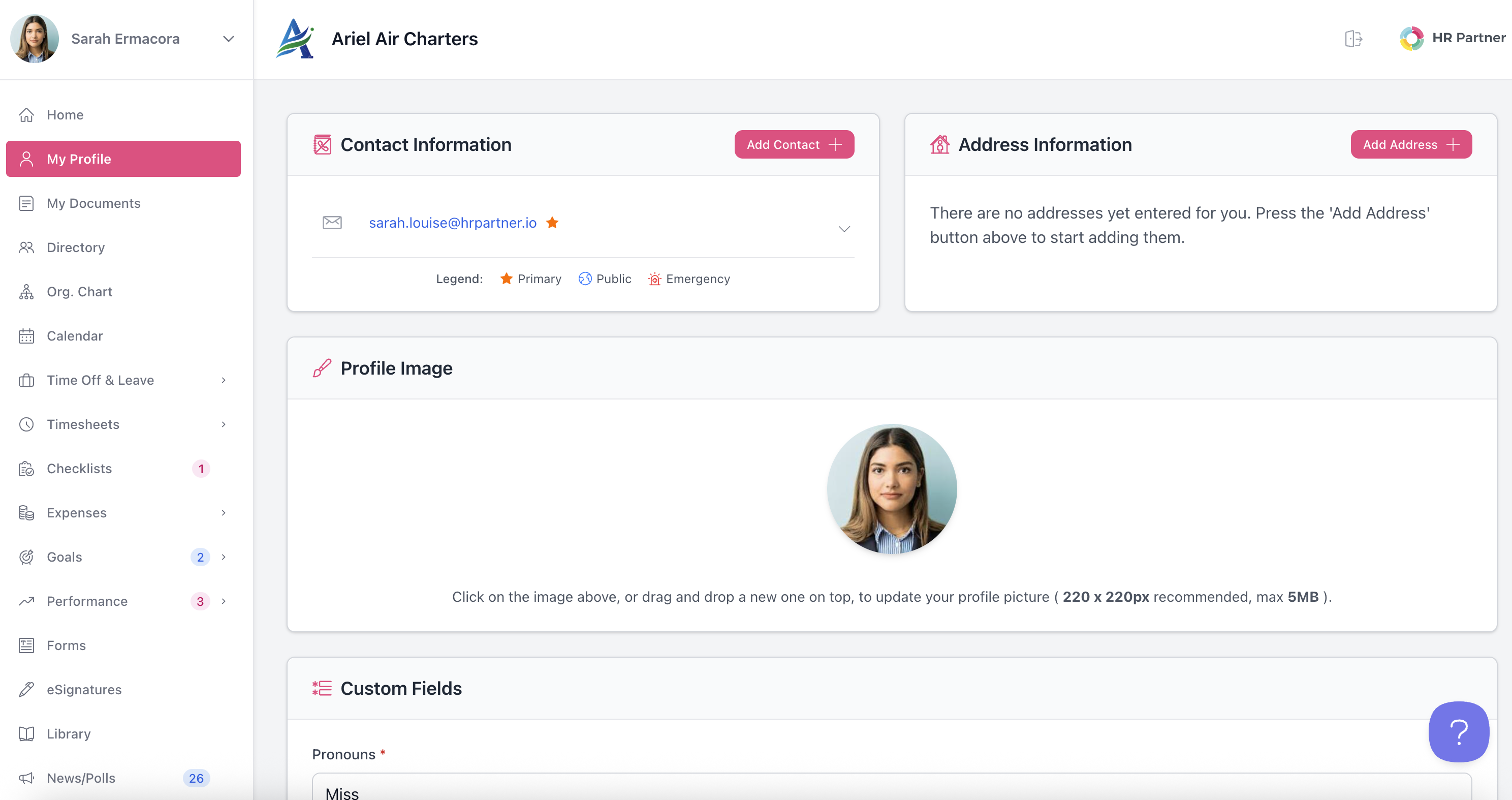 Go to your My Profile page to update Contact Information and Address Information, including Emergency Contact information for your Managers to see and access if the need arises.
